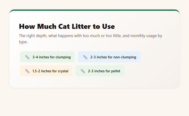 3 to 4 inches for clumping clay litter. 2 to 3 inches for non-clumping. 1.5 to 2 inches for silica crystals. These depths give cats enough material to dig and cover while keeping clumps from hitting the box bottom.